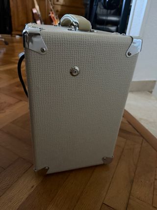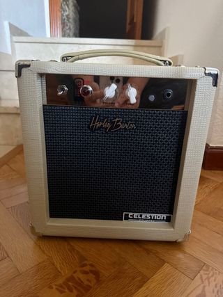 Amplificador Harley Benton Tube5 con altavoz Celestion. Le cambié hace poco las válvulas por una Tung-Sol 12AX7/ECC83 de alta ganancia y microfonía ultrabaja, para el previo y por una Electro Harmonix 6V6GT de potencia (unos 80€ en total, las dos fabricadas en Rusia, que hacen que suene cálido y muy, muy bien. El altavoz Celestion de 8” también cumple perfectamente. Se puede usar con 5W y con 1W de potencia, perfecto para casa. Coge los pedales de maravilla. Está en perfecto estado. - Color beige. - Asa superior. - Panel frontal con controles de volumen y tono. No rebajo de momento, y prefiero entrega en mano, aunque también envío.