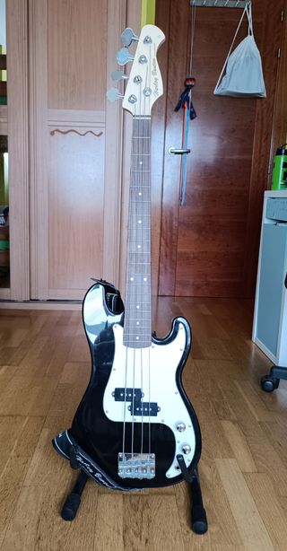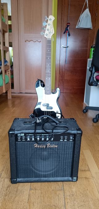 Bajo eléctrico tamaño infantil de la marca Harley Benton. Se envía con funda y caballete de soporte. Amplificador Harley Benton con dos entrradas. Se encuentra en perfecto estado, sin usar.