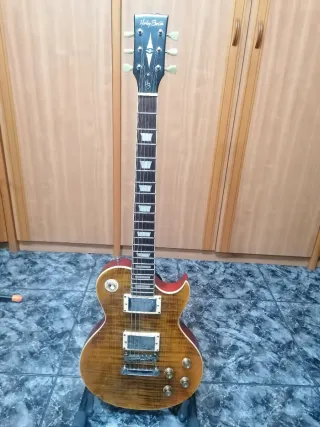 Guitarra eléctrica Harley Benton tipo Les Paul, con un acabado en madera de color miel y detalles en rojo. - Cuerpo de madera con acabado flanbeado - Mástil de madera con incrustaciones blancas. - Acción baja de cuerdas - Pastillas dobles Roswel Haf Alnico V Zebra - 22 trastes acción baja de cuerdas - Mástil encolado - Herrajes DLX cromo - En mi perfil hay también un amplificador si interesan las dos cosas ajusto el precio