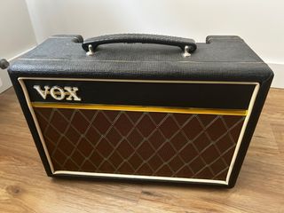 Amplificador de guitarra VOX Pathfinder de 10 vatios. Compacto y con el diseño clásico de VOX. - Revestimiento negro texturizado. - Rejilla frontal con patrón de diamantes. - Ribete blanco y detalles dorados.