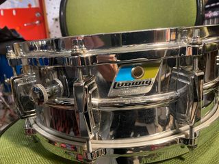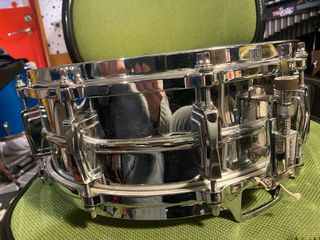 Caja Ludwig Supraphonic de los años 70. Medida 14”x5” Creo recordar que estaba fabricada entre 1976 y 1979. Se puede comprobar en algun listado de numeros de serie (buscar en internet vintagedrumguide) Todo un clásico. Se entrega con aros DIE CAST, que le imprimen un sonido realmente potente. Bordonera PureSound especial para evitar acoples y buzz. Se entrega con un parche ambassador o soundcontrol.