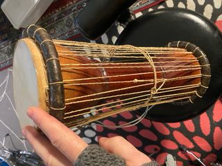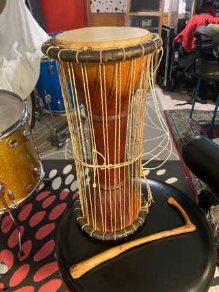 Tambor de piel, tama o tambor parlante. se percute mientras se aprienta bajo el brazo. Incluye baqueta de madera.