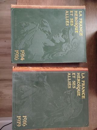 FRANCIA HEROICA Y SUS ALIADOS. Larousse Paris La France héroïque et ses alliés, Tomes 1&2: 1914-1916 + 1916-1919 par Gustave Geffroy, Léopold-Lacour et Louis Fumet. Librairie Larousse, 1919. 317 + 324 Pages. Format: 25x32cm. Poids: 5644 grammes. E78. Tome 1: 1916. 591 reproductions photographiques, 26 planches hors-texte en couleurs, 6 cartes en couleurs, 8 cartes en noir. Tome 2: 1919. 692 reproductions photographiques, 25 planches hors-texte en noir et en couleurs, 5 cartes en couleurs, 9 cartes en noir. Livres en bon état, reliures un peu frottées, intérieurs très propres.