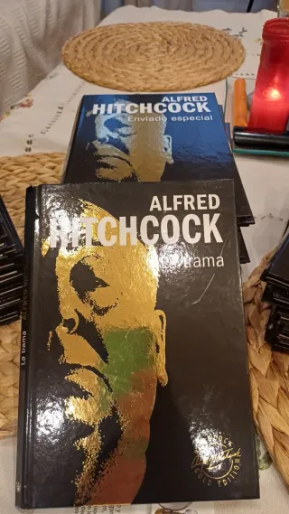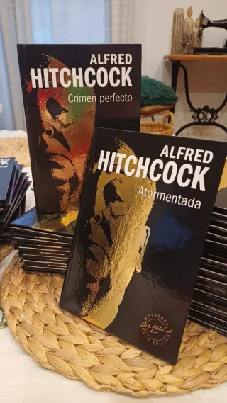 Colección de DVDs de Alfred Hitchcock en su edición Gold. - Incluye títulos como Crimen perfecto y Tormentada. - Diseño de portada con rostro de Hitchcock en acabado dorado.
