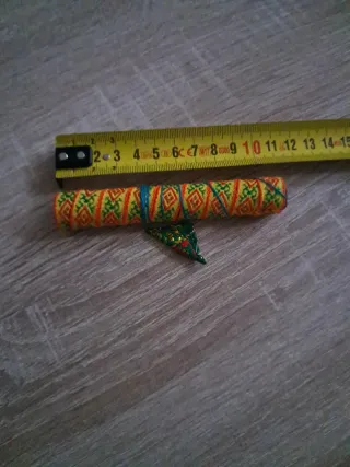 Instrumento musical tradicional Dan Moi. Longitud 10 cm.. Tamaño: medio. El video enviaré por privado. - Fabricado en metal. - Diseño con hilo decorativo en naranja, amarillo y verde. - Incluye una pequeña pieza decorativa triangular.