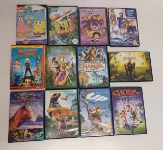 Lote 11 películas infantiles en formato DVD: - Bob Esponja: Travesuras Marinas - Bob Esponja: El Robo de la Fórmula - Las monstruosas aventuras de Zipi y Zape - 20.000 Leguas de Viaje Submarino - Monstruos contra Alienígenas - Enredados - Las Crónicas de Narnia: El Príncipe Caspian - Las Crónicas de Spiderwick - Dinosaurio - Caminando entre Dinosaurios - Up: Una Aventura de Altura - Shorts La Piedra Mágica