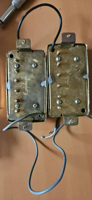Pastillas originales de una Epiphone Explorer Korina del año 1999 made in korea (unsung). Se incluyen dos pastillas y tornillos. - Acabado dorado. - Diseño clásico de humbucker.