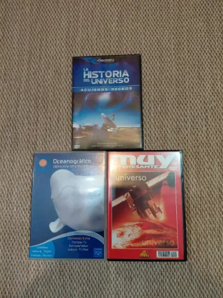 Pongo a la venta este pack de 3 documentales en formato DVD, todos en perfecto estado y con sus cajas originales. Un recorrido desde lo más profundo del océano hasta los confines del espacio. El lote incluye: La Historia del Universo: Agujeros Negros (Discovery Channel). Un análisis fascinante sobre los destructores más poderosos del cosmos. Universo (Colección Muy Interesante). Un viaje visual por la creación y evolución del espacio exterior. Oceanográfico: Descubre otro mundo. DVD oficial del famoso acuario, centrado en la vida marina (belugas, delfines, etc.). Incluye contenido extra como salvapantallas y juegos para PC/Mac.