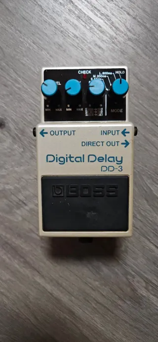 Pedal de efectos de guitarra Boss DD-3 Digital Delay. - Controles de nivel, feedback y modo. - Indicador LED de estado (CHECK). - Conexiones de entrada y salida.