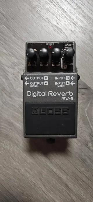 Pedal de efectos de guitarra Boss RV-5 Digital Reverb. Un clásico para añadir ambiente a tu sonido. - Cuatro perillas de control: LEVEL, TONE, REVERB, DELAY. - Modos: GATE ROOM, PLATE, HALL, ROOM, PLATE, SPRING, MODULATE. - Entradas y salidas: INPUT A (MONO), OUTPUT A (MONO), INPUT B, OUTPUT B.