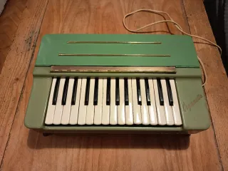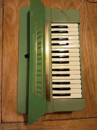 Vendo preciosa Hohner Organetta Typ 9806, fabricada en Alemania alrededor de 1958. Órgano de mesa eléctrico vintage con sonido característico a acordeón/melódica, ideal para decoración retro, coleccionistas o músicos experimentales. Color verde pistacho original impecable, 37 teclas, voltaje 110-220V (funciona perfectamente enchufado). Incluye cable original, suena genial y tiene ese encanto mid-century. Pieza rara en España, de las primeras series.