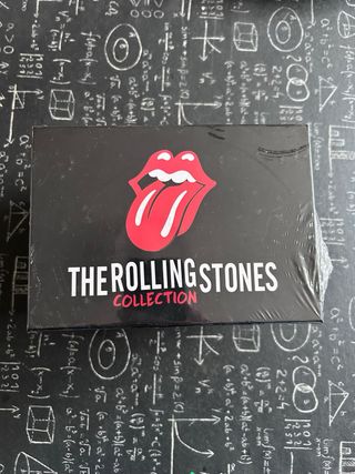 Pack de CDs de la colección de The Rolling Stones. Incluye varios álbumes icónicos de la banda. - Portada con el logo clásico de la lengua y los labios. - Mosaico de portadas de álbumes en la caja.