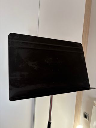 Atril de música metálico negro, perfecto para colocar partituras. Buena calidad, costo unos 30 euros. Cómo nuevo. - Diseño con agujeros. - Base de trípode. - Altura ajustable.