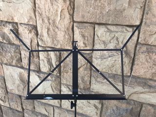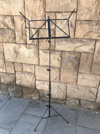 Atril plegable para partituras de color negro. Es un accesorio práctico para músicos. - Estructura metálica. - Diseño plegable para fácil transporte y almacenamiento. En perfecto estado
