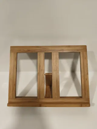 Atril de madera para colocar libros o partituras. Su diseño es sencillo y funcional. - Lo use para poner el libro de fotos de la comunión de mi hija era perfecto - Material: Madera natural. - Estructura robusta.