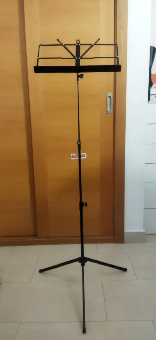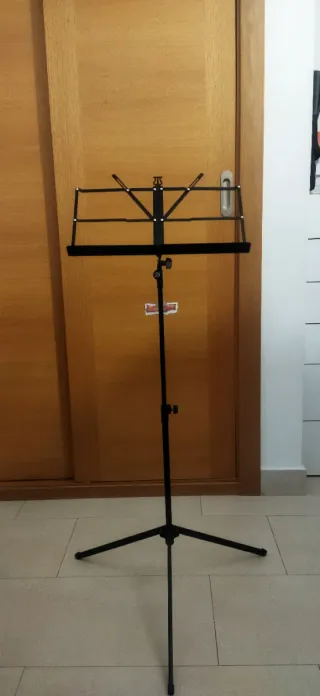 Vendo Atril metálico para partituras. Muy ligero, robusto y totalmente plegable para llevarlo a cualquier sitio. Es telescópico, llega a una altura estándar para tocar de pie cómodamente (140 cm - 150cm) Regulable y se ajusta fácilmente en altura y ángulo de lectura. Incluye varillas de sujeción para que no se muevan las hojas. En perfecto estado, todas las roscas aprietan bien y las patas tienen sus gomas originales. Es el modelo estándar reforzado. No es de los de juguete; aguanta perfectamente una carpeta de partituras pesada o un libro sin bajarse.