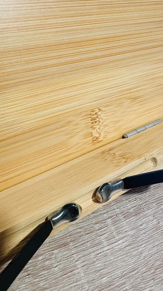 Práctico atril de lectura fabricado en bambú, ideal para sostener libros o tablets. - Diseño ajustable y plegable. - Material: Bambú y metal. Estado: muy bueno. Precio: valorado en 20€.