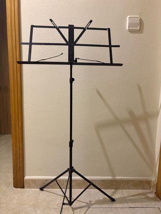 Atril de música negro, ideal para colocar partituras. - Altura ajustable. - Base trípode estable. - Bandeja para partituras.