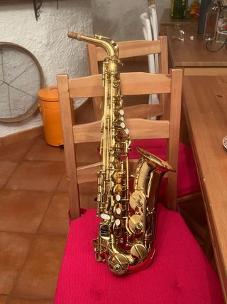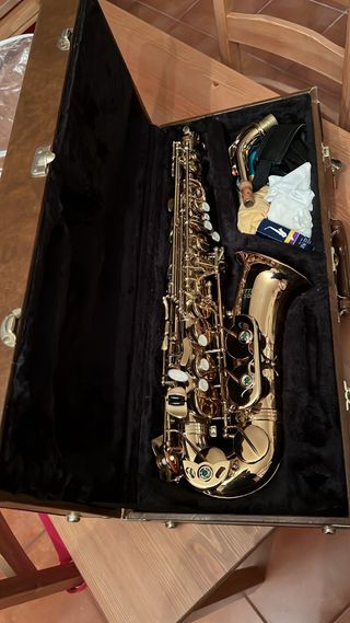 DISPONIBLE HASTA ÚLTIMOS DE MARZO. Saxofón alto con un sonido muy cálido. Perfecto para iniciarse en la musica , incluso como decoración es perfecto - Marca Belson - Acabado dorado brillante . - Incluye estuche , enganche cuello , boquilla , atril de madera , y diversas partituras