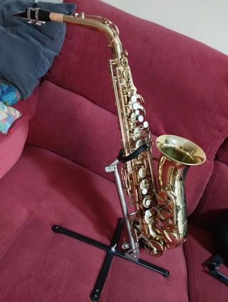 Saxofón alto de color dorado, listo para ser tocado. en muy buenas condiciones. y se regala atril para las partituras - Incluye estuche. - Acabado brillante. -con signos de desgaste en algunas zonas -hay que afinarlo