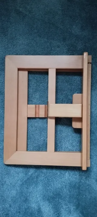 Atril de madera para exhibir o sostener objetos. - Fabricado en madera clara. - Diseño con soporte cruzado. - Apenas usado.