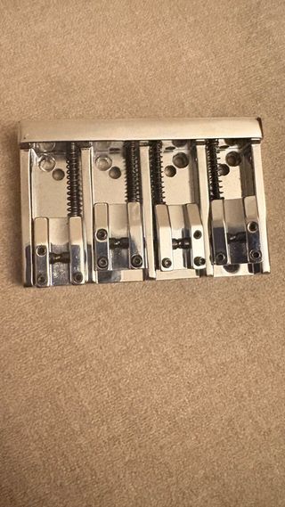 Puente para bajo eléctrico de 4 cuerdas con acabado cromado. - Diseño robusto y brillante. - Incluye tornillos de montaje.