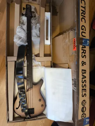 Bajo eléctrico G4M 972 de Gear4Music de 5 cuerdas multiescala. Comprado hace 2-3 años, bastante uso pero esta en buen estado, más allá de algunos dings en la pala y la rotura de pintura que se ve en la ultima foto. No hago envíos