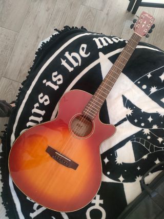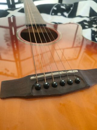 Clavijas y cuerdas recién cambiadas aunque no aparecen en la foto, no funciona la conexión al amplificador, debe de haber algún cable que ha dejado de hacer contacto, por eso el precio tan bajo. por lo demás suena increíble. Cuesta unos 270€ en tienda.