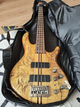 Bajo eléctrico de 5 cuerdas, fabricado por LUTHIER LOVANOB. Presenta un cuerpo de 2 piezas de Tilo premium (ver las vetas y detalles de este tilo para entender la denominación premium) con cámaras tonales, tapa del cuerpo de madera de Nogal americano con veta marcada. Mástil de maple con trastera de ébano. - Micrófonos bobinados a mano por el luthier FEDOR (Moscú, Rusia) de 5 cuerdas, alnico V. - Puentes y clavijas Wikilson (Corea Del Sur) El precio es bajo porque tiene un detalle en el mástil, aunque no afecta su funcionamiento, es un detalle estético ( pequeña rayadura ) presente en la foto. De €1400 a €1000