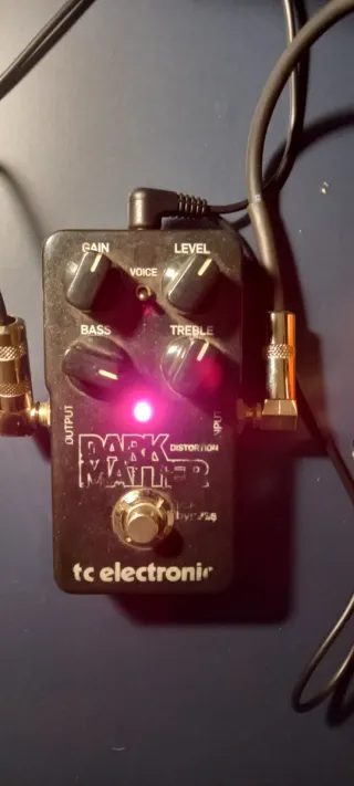 Pedal de overdrive distorsión TC Electronic Dark Matter para guitarra o bajo. Color negro. Es lo que llaman un Marshall in a box. Un pedal muy versátil: va desde un overdrive ligero pasando por sonidos más Hard rockeros hasta llegar a una distorsión heavy e incluso thrash. Se queda escaso para tocar metal moderno. Equivaldría a un Marshall Guvnor o Drive master. Graves y agudos independientes para esculpir el sonido con precisión. Velcro en la base. - Controles de Gain, Level, Bass y Treble e interruptor voice para pasar a un sonido más crujiente con más medios. - Indicador LED de encendido. - Diseño robusto. - True bypass.