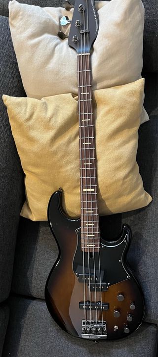 Cuerpo de 3 piezas de aliso Mástil de 5 piezas de arce/caoba Diapasón de palisandro (Dalbergia Latifolia) 21 trastes medium Escala larga de 864 mm 1 pastilla 'Split' de bobina simple y 1 pastilla 'Bar' de bobina simple Ecualizador activo de 3 bandas Controles: Volumen, balance, graves, agudos Conmutador activo/pasivo Herrajes Yamaha con acabado en cromo Color: Dark Coffee Sunburst brillante Incluye funda