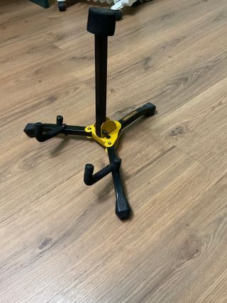Soporte plegable para guitarra o bajo, marca HERCULES. - Diseño robusto y seguro. - Color negro y amarillo.