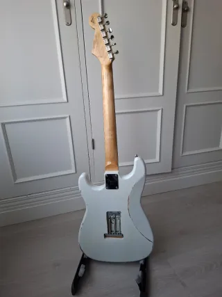 Strato hecha por partes con relic suave y nitro. Color blancos con plásticos envejecidos. Cuerpo de aliso, dismapasón de palosanto. Pastillas de Fender Viniera. Acción baja, muy cómoda de tocar. Doy preferencia a trato en mano. Para cambios solo archtop para jazz tipo ibanez af 55, Epiphone Emperor, D'Angelico Emperor o amplificador DV Mark Jazz. Doy prioridad a trato en mano para que se pueda probar.