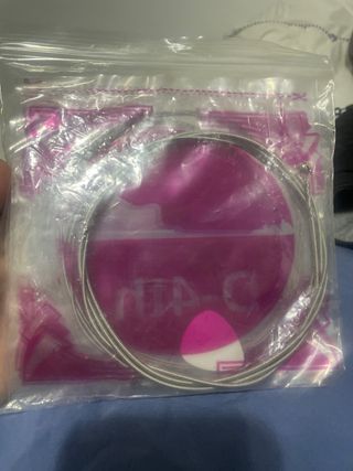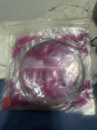 Juego de cuerdas de repuesto para bajo. Incluye dos púas. - Cuerdas de metal enrolladas. - Púa de color rojo.