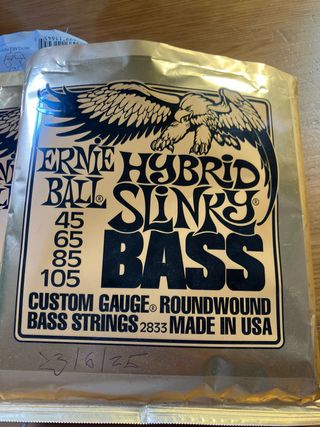 Juego de cuerdas para bajo eléctrico Ernie Ball Hybrid Slinky. Usadas para tres ensayos y dos bolos. Durante el 2025. €10 el paquete. 6 paqutes, €40☝🏻☝🏻 - Calibre: Custom Gauge Roundwound 45-65-85-105. - Fabricadas en USA. - Precio por paquete...€10