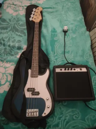Se vende bajo eléctrico 3RD AVE junto con un amplificador de 15W. Incluye funda para el bajo. - Bajo eléctrico de 4 cuerdas. - Amplificador de 15 vatios. - Color del bajo: azul y blanco. -Con cuerdas de repuesto