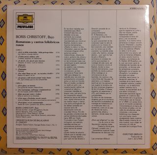 En Cartagena LPs de mi propia colección: Clásica, New Age, Jazz, Blues, Rock (Duro, Sinfónico, Progresivo, Glam...), Folk, Pop, Funk, ... todos los estilos Álbum de Canciones Folklóricas Rusas, grabado en 1977, con la Orquesta Rusa de Balalaikas y el prestigioso bajo búlgaro Boris Christoff, el cual es considerado uno de los mejores bajos de ópera del siglo XX pertenecientes a la tradición eslava. Su talento ya asomaba cuando cantaba siendo un niño en el Coro de la Catedral de Sofía. -Estado: IMPECABLE +++++ (NM) -Ed. 1986, España -Sello: Deutsche Grammophon -Ver fotos -Se agrupan artículos para reducir gastos -Embalaje perfecto