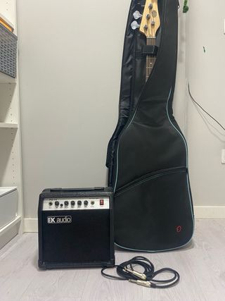 Pack completo para bajo eléctrico. - Amplificador EK Audio PG-15. - Funda de bajo negra con ribete azul. - Cable de conexión con conectores dorados. La guitarra está en bien condición, pero tiene unos arañazos, los cuerdas están un poco oxidadas, pero aún se suena bien. El cable es de 2.5-3 metros. El amplificador “EK audio” funciona bien, en condición casi nuevo y era poco usado. La funda en condición perfecta, lleva un bolsillo enfrente. VENDO TODO JUNTO, NO HAGO ENVÍOS!!! El costo original de las cosas: Guitarra bajo: 130€ Amplificador: 75€ Cable: 15€ Funda: 25€ El precio original fue 250€ Pero lo vendo más barato!