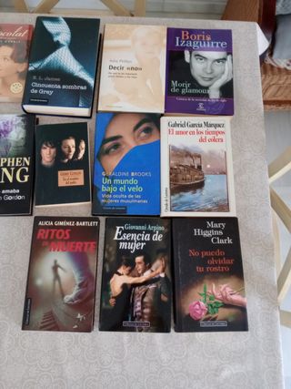 12 libros en perfecto estado. Algunos muestran leves señales de uso. Títulos incluidos: Cincuenta sombras de Grey, Decir no, Morir de glamour, El amor en los tiempos del cólera, Un mundo bajo el velo, Ritmos de muerte, Esencia de mujer, No puedo olvidar tu rostro, La chica que amaba a Tom Gordon, El perfume, Turpial, Chocolate y La pasión turbia. - Géneros: drama, clásicos, romance, suspense y thriller. - Idioma: español.