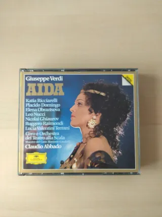 Ópera AIDA de Giuseppe Verdi, dirigida por Claudio Abbado. Grabación digital de la Deutsche Grammophon. Esta versión de Aida (1982) bajo la dirección de Claudio Abbado fue aclamada por aportar frescura, vitalidad y precisión a una partitura que a menudo se interpretaba de forma rutinaria. Abbado logró un equilibrio entre la grandiosidad envolvente de las escenas de conjunto y la intimidad dramática de los actos finales. Destaca Plácido Domingo en la plenitud de su carrera.
