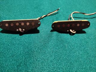 Par de pastillas single coil Alnico 5. Una es de una Strato Nick johnston posición Nick, y la otra es una’’ Q Pickup’’ de primera generacion bobinada a mano bajo pedido. Evidentemente esas dos se pueden poner en posición que quieras, Neck o Bridge. La QPickup: 6,70 Kohms La Nick Johnston: 5,70 Kohms La foto de la Tienda de Q Pickup al final es indicativa, la que vendo fue hecha bajo pedido.