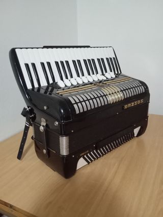 En buenas condiciónes. Buen sonido, afinado y potente, correas nuevas. 120 bajos 11 registros + 1 general 3 registros en los bajos. -Detalles: Tiene una pequeña grieta (la foto 6) y por alli pierde muy poco de aire pero no se aprecia, el fuelle esta en perfectas condiciónes. -Los bajos: De vez en cuando se queda una nota de los bajos sonando y usando el fuelle ya no se queda. Son detalles que con un poco de atención se arreglan. Pese a eso, el sonido esta muy bien y se puede usar perfectamente.