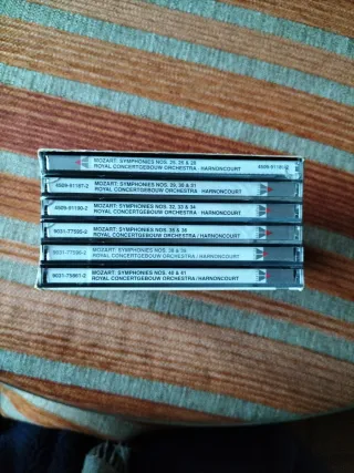 Edición en 6 CDs de Mozart – Famous Symphonies, interpretada por la Royal Concertgebouw Orchestra bajo la dirección de Nikolaus Harnoncourt. Grabación Teldec, digital, con las sinfonías nº 25–26–28–29–30–31–32–33–34–35–36–38–39–40–41. Interpretación históricamente informada, orquesta de referencia y sonido de gran calidad. Estuche completo, discos en muy buen estado.