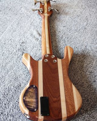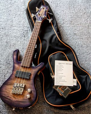 Krim guitars. Ukebass Phantom •Cuerpo: laminado 13 capas •Tapa: Arce flameado •Mástil: laminado 5 capas •Diapasón: palosanto •Radio: 12" •Trastes: jumbo acero inoxidabre •Escala: 17,1" •Afinadores: cromo •Puente: Göldo HW60C •Pastilla: EMG 35DC •Electrónica: activa 1 volumen 1 tono •Acabado: sunburst purple poliuretano •Peso: 2,5Kg. •Enganches de seguridad: si •Funda de transporte: si •Correa: si