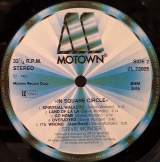 Stevie Wonder –En un círculo cuadrado Portada del álbum Stevie Wonder - In Square Circle Más imágenes Sello : Motown – ZL 72005 Formato : Vinilo , LP, Álbum , Relieve, Desplegable País : Europa Publicado : 1985 Género : Electrónica , Funk/Soul , Pop Estilo : Disco , Downtempo , Jazzdance , Synth-pop , Soul A1 Amante a tiempo parcial 4:09 A2 Te amo demasiado 5:30 A3 Paradero 4:17 A4 Extraño en la orilla del amor 5:01 A5 Nunca bajo el sol 4:07 B1 Caminantes espirituales 5:12 B2 Tierra de La La 5:14 B3 Ir a casa 5:18 B4 Lleno de alegría 3:42 B5 Está mal (Apartheid) 3:29