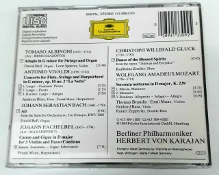 Este CD de música clásica incluye obras de Albinoni, Pachelbel y Mozart, interpretadas por la Berliner Philharmoniker bajo la dirección de Herbert von Karajan. - Albinoni: Adagio - Pachelbel: Canon - Bach: Air - Vivaldi: La Notte - Mozart: Serenata notturna - Gluck: Reigen seliger Geister (Dance of the Blessed Spirits) - Artista: Berliner Philharmoniker - Director: Herbert von Karajan - Sello: Deutsche Grammophon - Código: STEREO 413 309-2