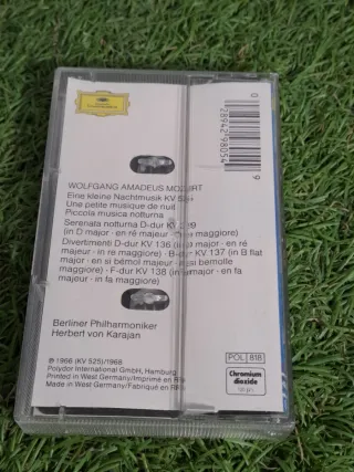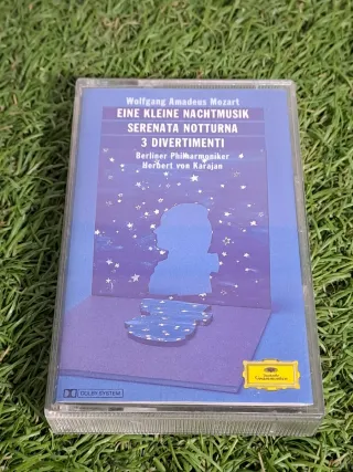 Cinta de cassette con obras de Wolfgang Amadeus Mozart. - Incluye Eine Kleine Nachtmusik, Serenata Notturna y 3 Divertimenti. - Interpretado por la Berliner Philharmoniker bajo la dirección de Herbert von Karajan. - Cuenta con sistema Dolby System.