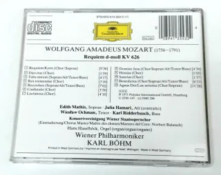 CD de música clásica, Requiem de Mozart. - Interpretado por Edith Mathis, Julia Hamari, Wiesław Ochman y Karl Ridderbusch. - Orquestado por la Wiener Philharmoniker bajo la dirección de Karl Böhm. - Grabación STEREO de Deutsche Grammophon.