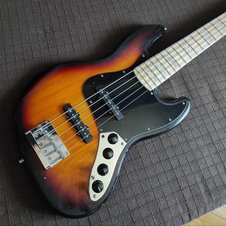 Bajo eléctrico tipo Jazz Bass de 5 cuerdas, urge venta por mudanza. - Mástil de luthier (G&B) hecho a mano de madera de arce duro, incrustaciones de madre perla, trastes medium jumbo y cejuela de hueso. - Cuerpo Squier Deluxe JB V, acabado sunburst. - Electrónica pasiva/activa con selector de modo, volumen, blend y ecualizador tres bandas; pastillas Lollar JB 5S (pastillas originales Fender también incluidas), golpeador tricapa a medida con extensión estilo Fender Marcus Miller y cubre-pastillas. Las fotos forman parte de la descripción. PVP original: 966,50€ (Fabricación del mastil, electrónica, pastillas, golpeador y strap lock