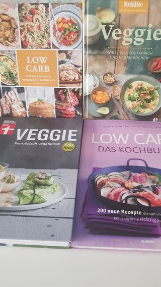 Low Carb, Veggie, Das Kochbuch. Son 4 libros en alemán de recetas veganas y baja en hidratos de carbonos. Estado de los libros : nuevo! Precio es 5€ cada uno.